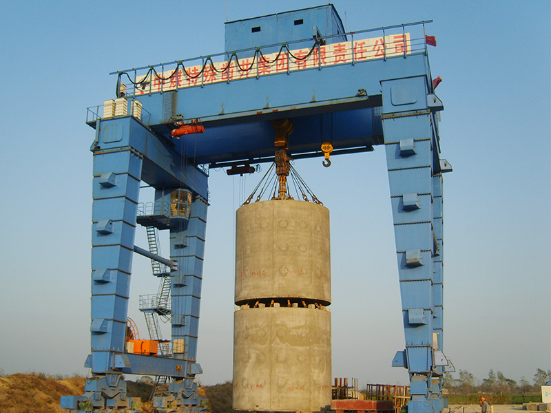 自頂升門式起重機(jī)和U型門式起重機(jī)類似,門架結(jié)構(gòu)為U型門機(jī),區(qū)別在于支腿不同。由于特殊工作場合,大型起吊設(shè)備無法進(jìn)場,自頂升門機(jī)支腿制作成幾段,每段支腿上都有千斤頂頂升支座。小車、主梁端梁組裝好后,采用千斤頂頂起,依次將每段支腿用法蘭連接到一起。之后安裝下橫梁、大車運(yùn)行機(jī)構(gòu)。